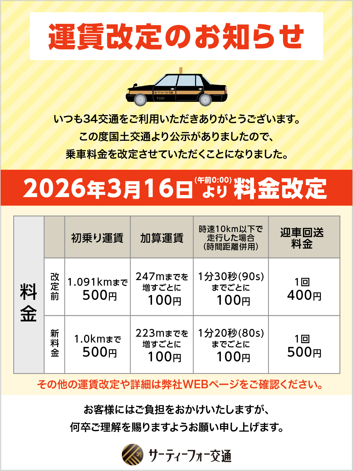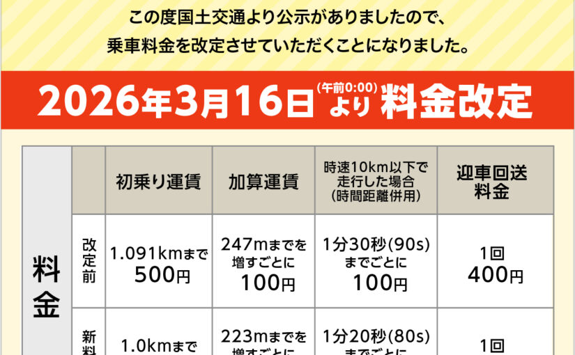 【重要】タクシー運賃および料金改定のお知らせ(2026年3月16日00:00より)